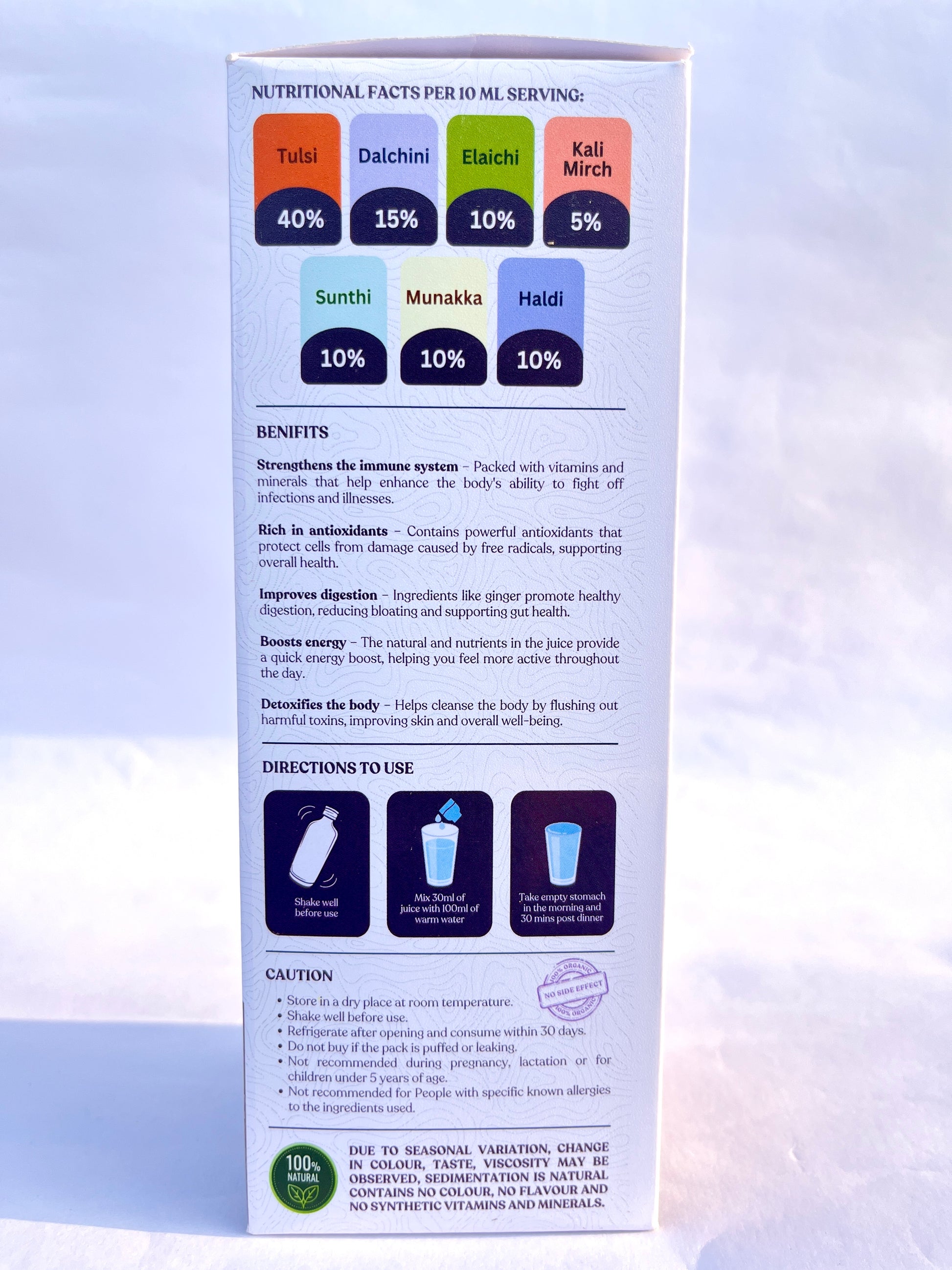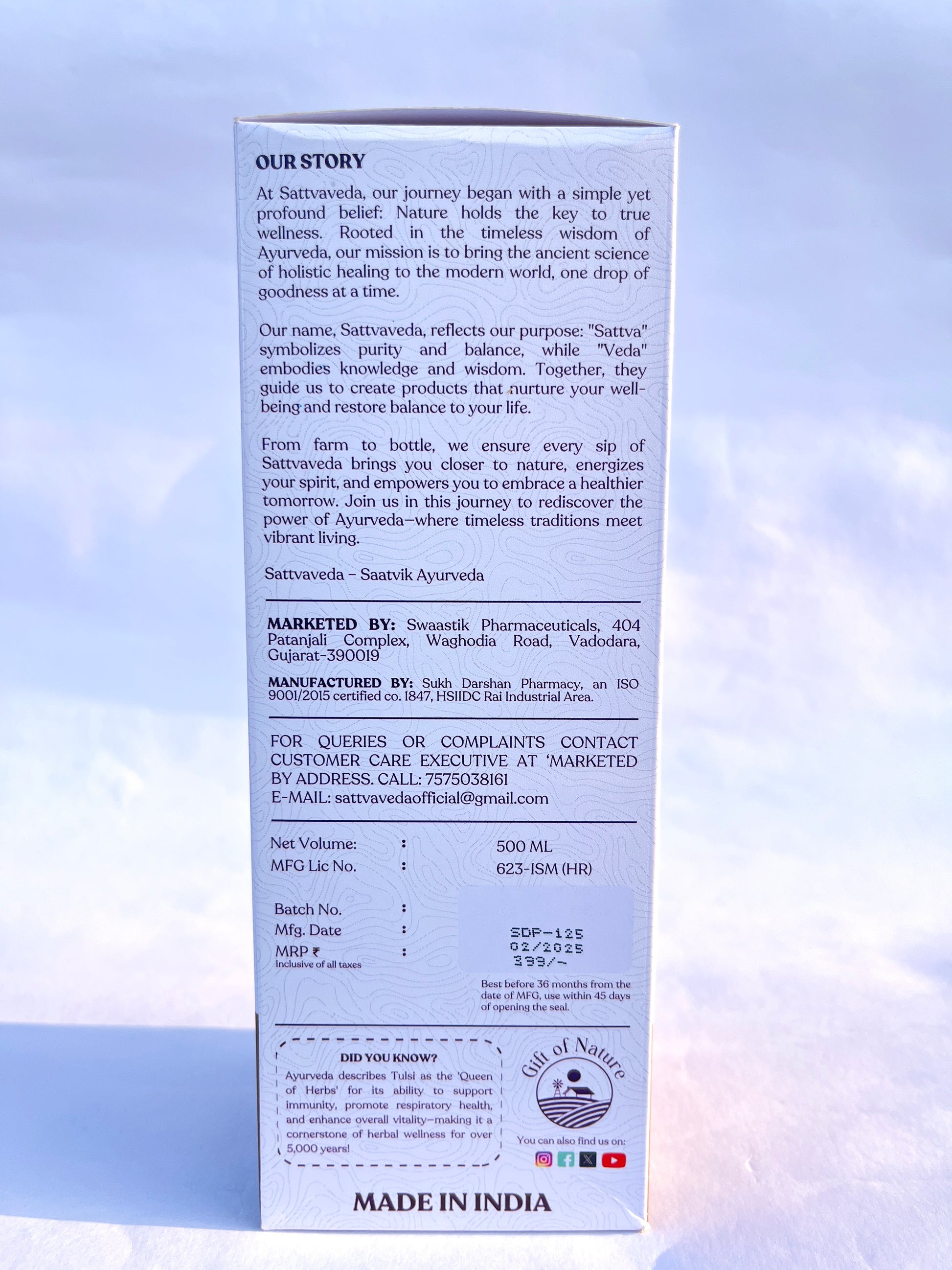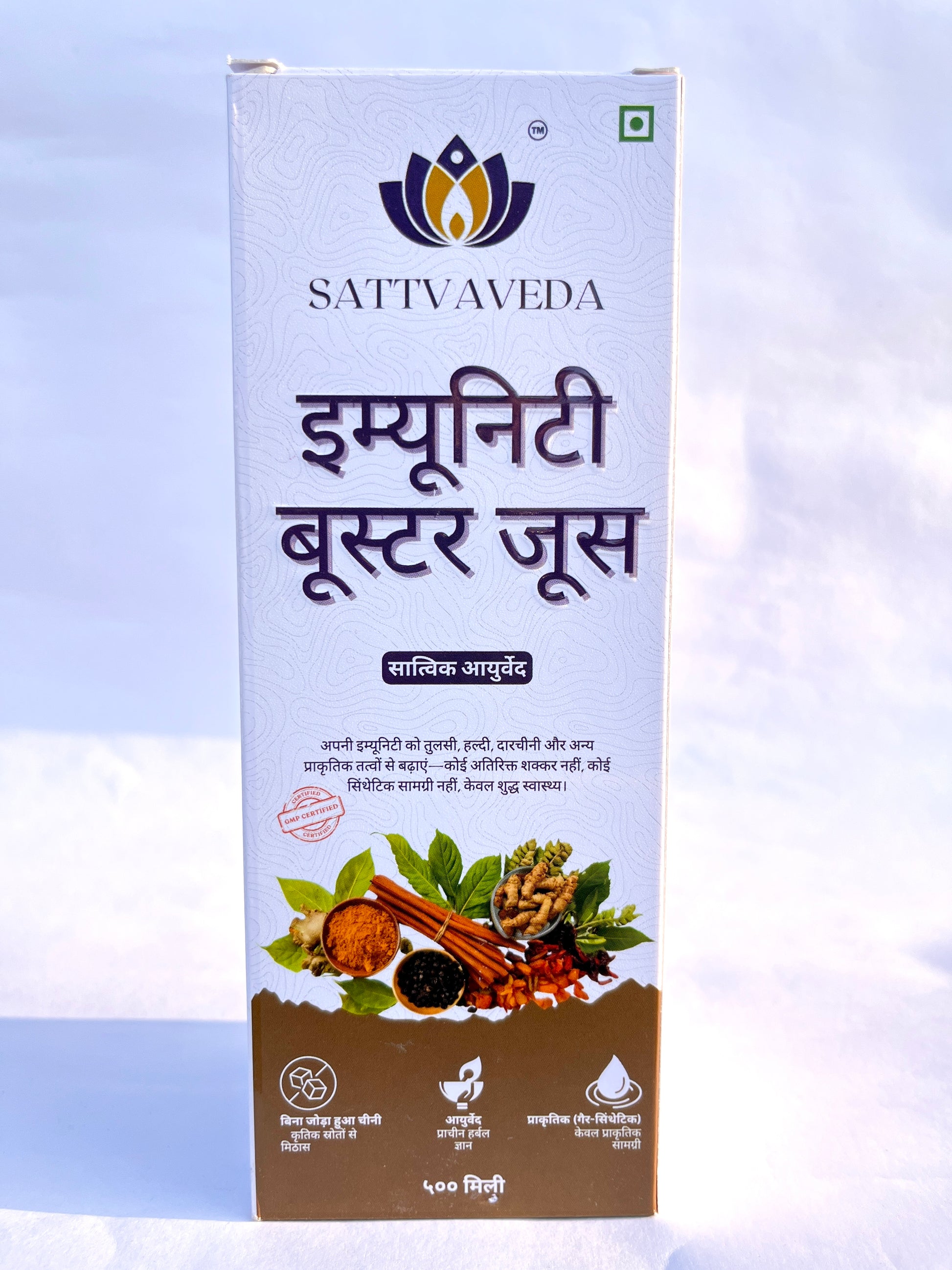 Sattvaveda’s Immunity Booster Juice combines Amla, Giloy, Tulsi, Ashwagandha, and other powerful Ayurvedic herbs to strengthen your immune system, fight fatigue, and support overall health.